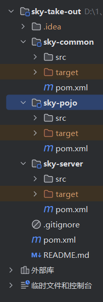 不同于tlias这种基础的项目,把各种东西都塞在一个模块中显得庞杂紊乱,苍穹外卖实现的是分模块组织项目: